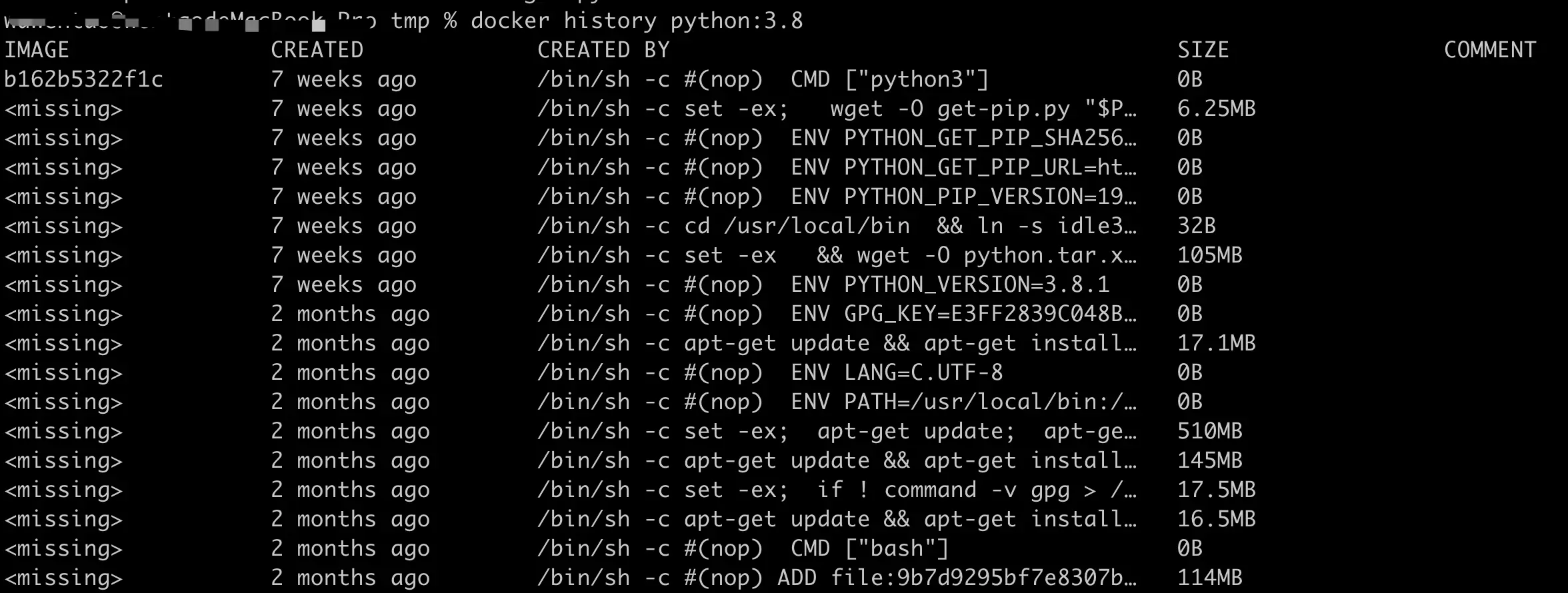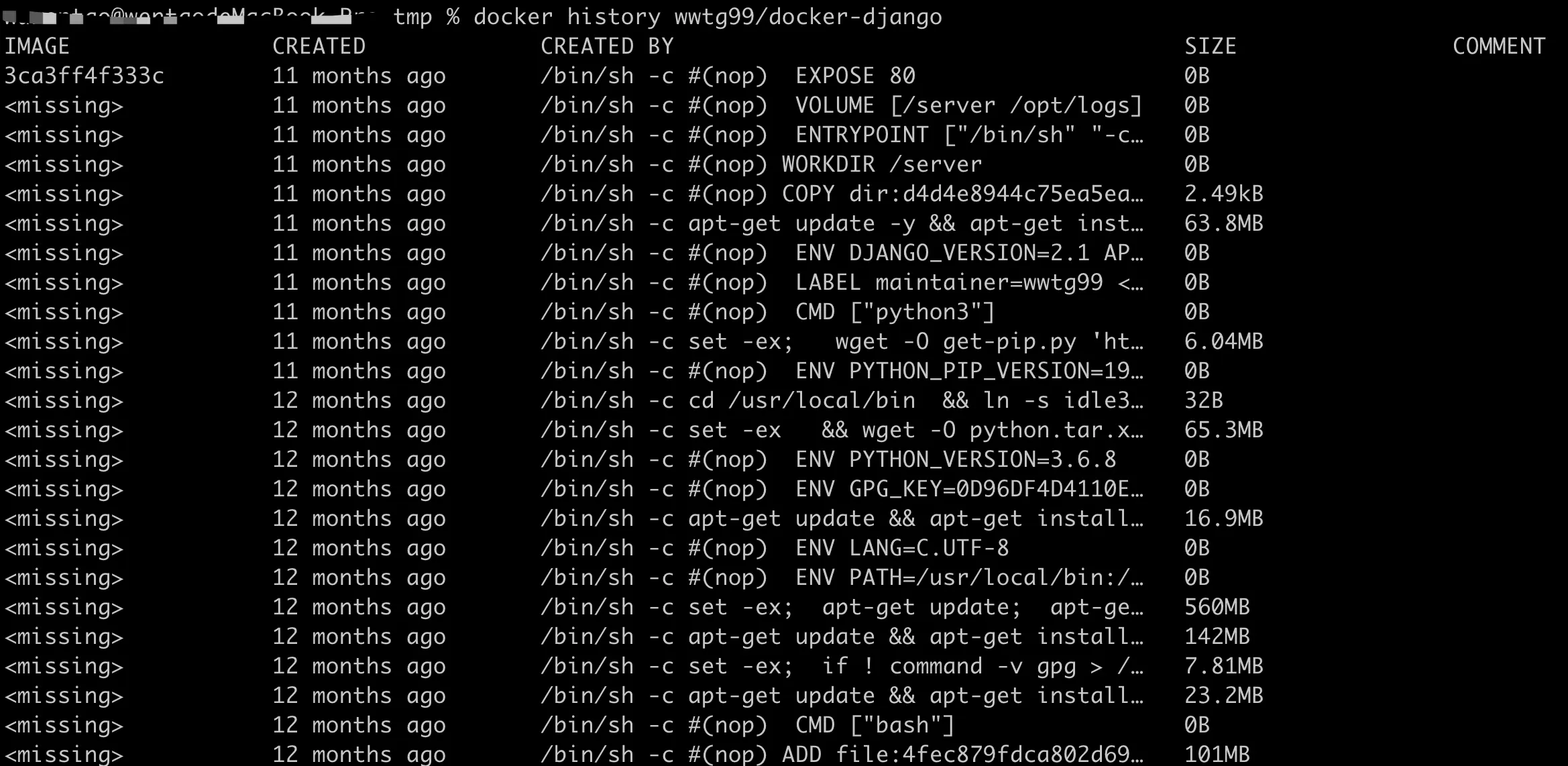 我们可以用 docker history 命令查看我们创建的镜像,相同的层将共享且只保存一份。
