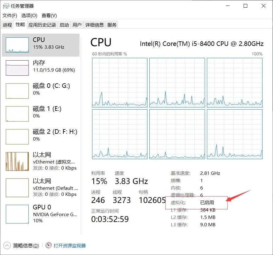 开启之后我们进入"任务管理器"可以看到虚拟化是否启用,如下图: