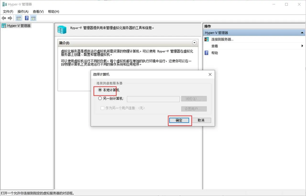 进入Hyper-V管理器后需要连接到本地服务器,连接到服务器: