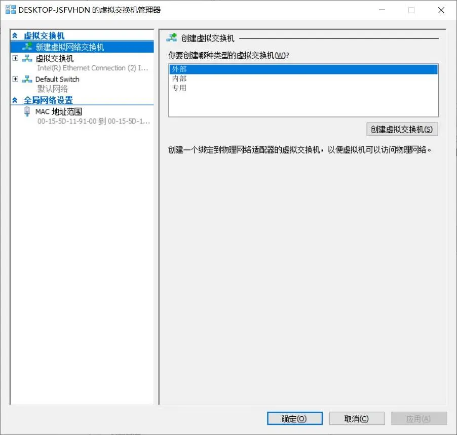 新建的一个“虚拟网络交换机”,类型为“外部”,然后点击“创建虚拟交换机”