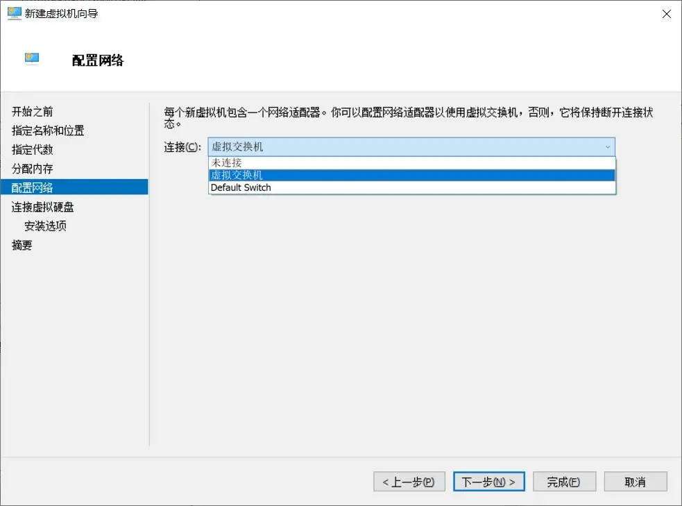 这里我们选择刚刚创建好的虚拟交换机,继续下一步,如果不选择那可能无法联网: