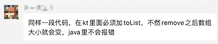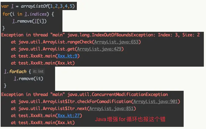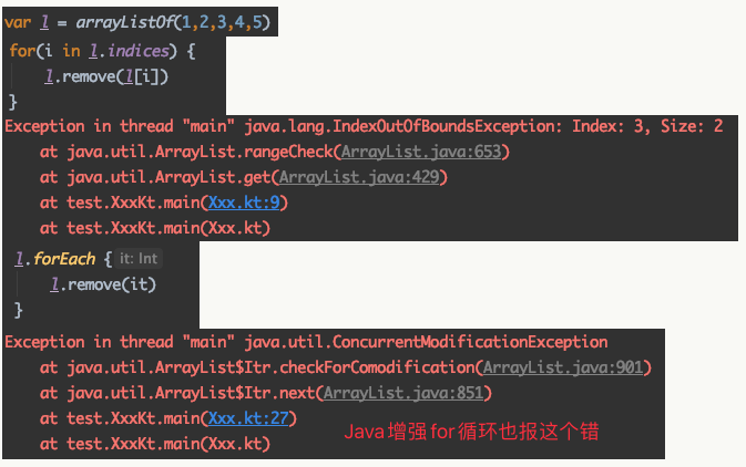 1、普通for循环(下标遍历),类似的代码,Java不报错,Kotlin却抛 IndexOutOfBoundsException;
