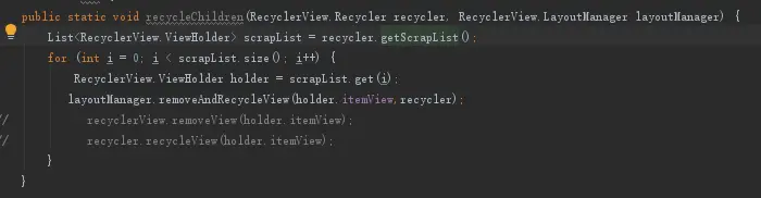其实我并没有理解他的问题,就开始跟起了RecyclerView的源码,再经历过一番排查得出: