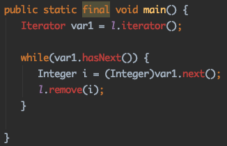 - Integer i = (Integer)var1.next() → 获取第一个未遍历元素,赋值给临时变量i