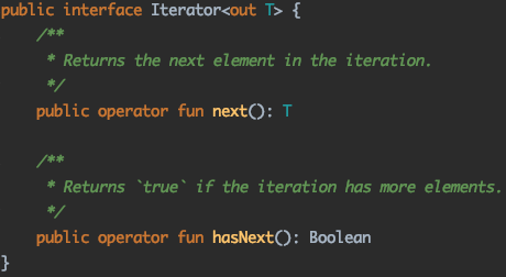两个函数:next() => 返回当前迭代元素;hasNext() => next前调用此方法判断是否迭代到终点