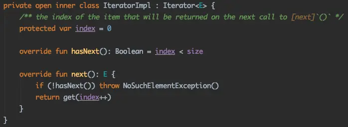 而Kotlin则不一样,点开 for(i in l.indices) 里的indices: