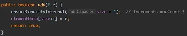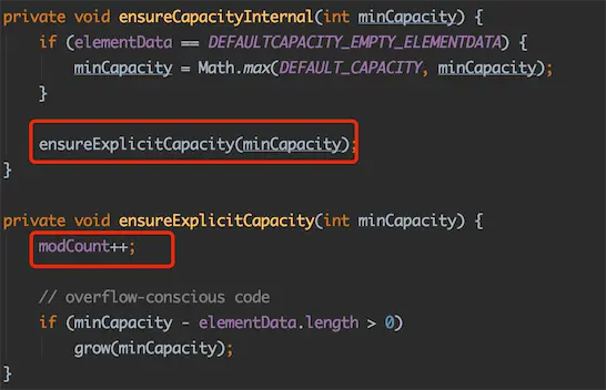 而add(),addAll() 方法虽然没有明写modCount++,但暗地里调用ensureCapacityInternal()完成自增:
