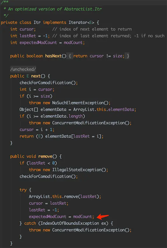 expectedModCount → 预计修改次数,调用Itr迭代器中的remove方法时,会调用列表的remove方法,而后将modCount赋值给expectedModCount,即保证遍历过程中两个值是相等的;