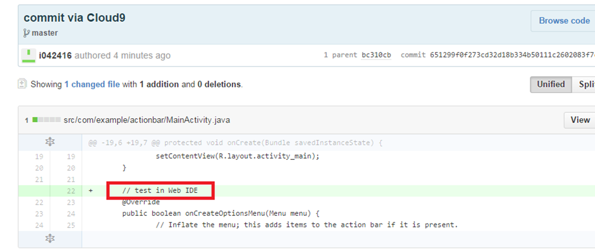 之后在github上刷新页面能够看到从cloud9上推送过来的change: