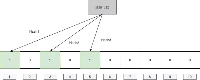 举个例子,假设我们一开始m是10,K是3。我们遇到第一个插入的值是”线性代数“,我们对它hash之后得到1,3,5,那么我们将对应的位置标记成1.
