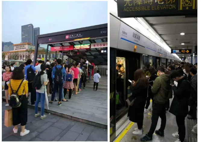 上午8:00时:1万人到地铁口坐地铁,地铁里面只能容纳4000人;6000人地铁口外面等着。