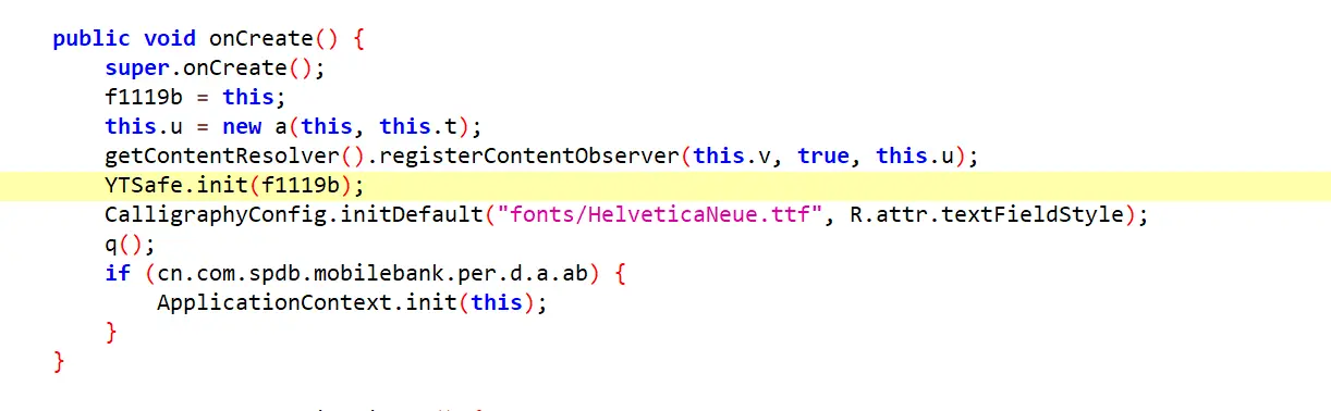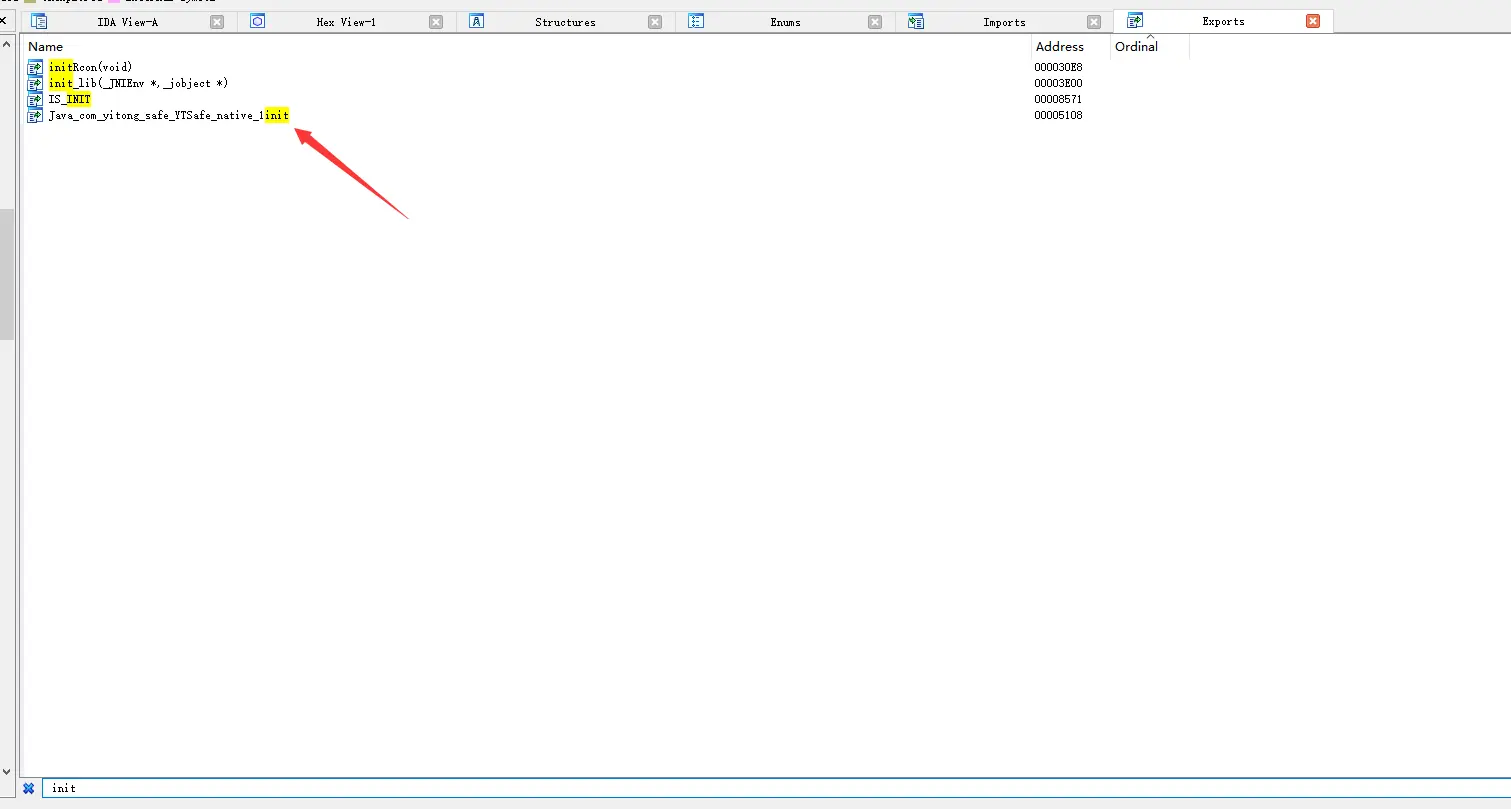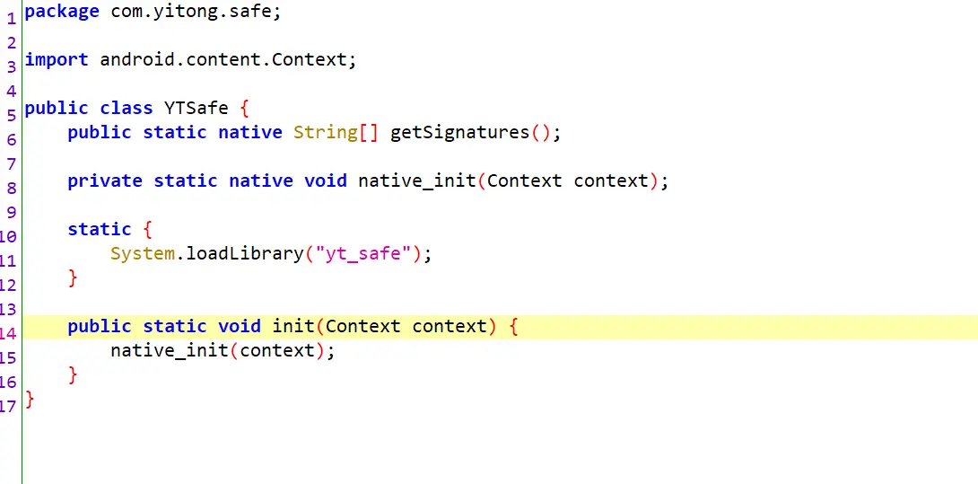 这就有点敏感了 心里已经10有8 9确定了签名校验在so层 然后这个init又调用了一个native_init函数 传入了一个context 既然如此就去so看看