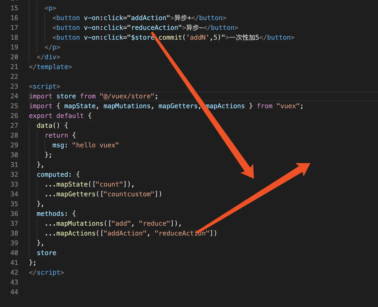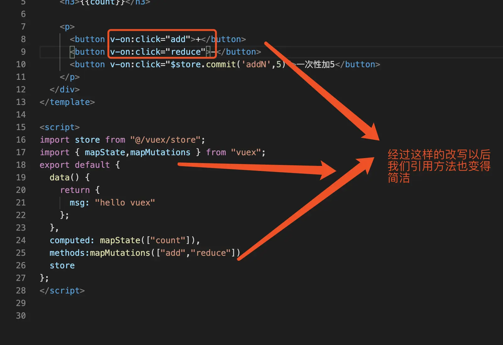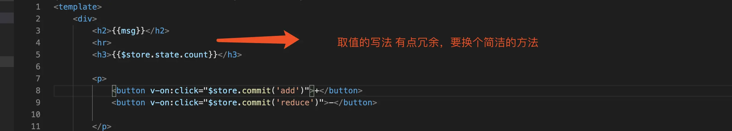 <button v-on:click="$store.commit('reduce')">-</button>