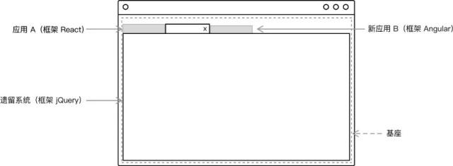 前端微服务化。在不同的框架之上设计通讯、加载机制,以在一个页面内加载对应的应用。