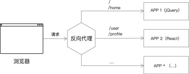 路由分发式。通过 HTTP 服务器的反向代理功能,来将请求路由到对应的应用上。