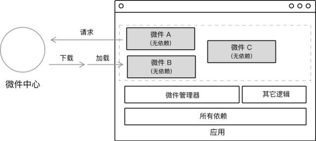 微件化 在非单面应用时代,要实现微件化方案,是一件特别容易的事。从远程加载来对应的 JavaScript 代码,在浏览器上执行,生成对应的组件嵌入到页面的相应部分。对于业务组件也是类似的,提前编写好我们的业务组件,当需要对应的组件时再响应、执行。