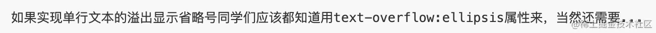 如果实现单行文本的溢出显示省略号同学们应该都知道用text-overflow:ellipsis属性来,当然还需要加宽度width属来兼容部分浏览。实现方法:
