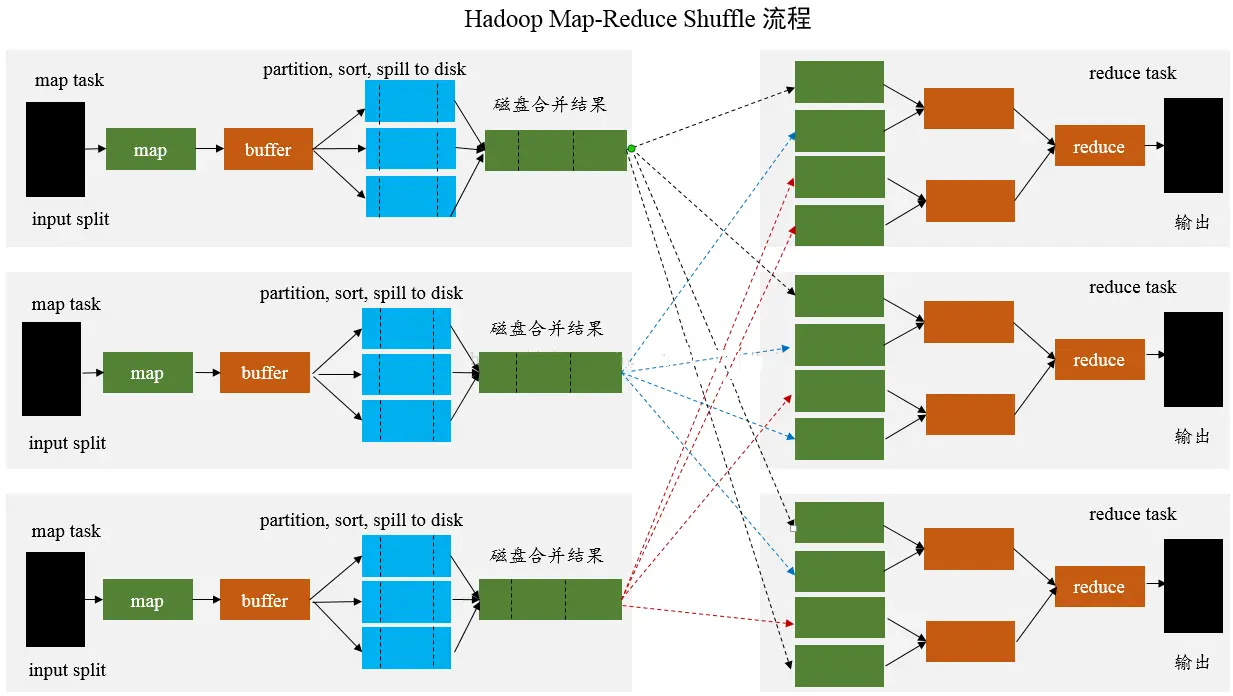 在MapReduce框架,Shuffle是连接Map和Reduce之间的桥梁,Map阶段通过shuffle读取数据并输出到对应的Reduce,而Reduce阶段负责从Map端拉取数据并进行计算。在整个shuffle过程中,往往伴随着大量的磁盘和网络I/O。所以shuffle性能的高低也直接决定了整个程序的性能高低。而Spark也会有自己的shuffle实现过程。