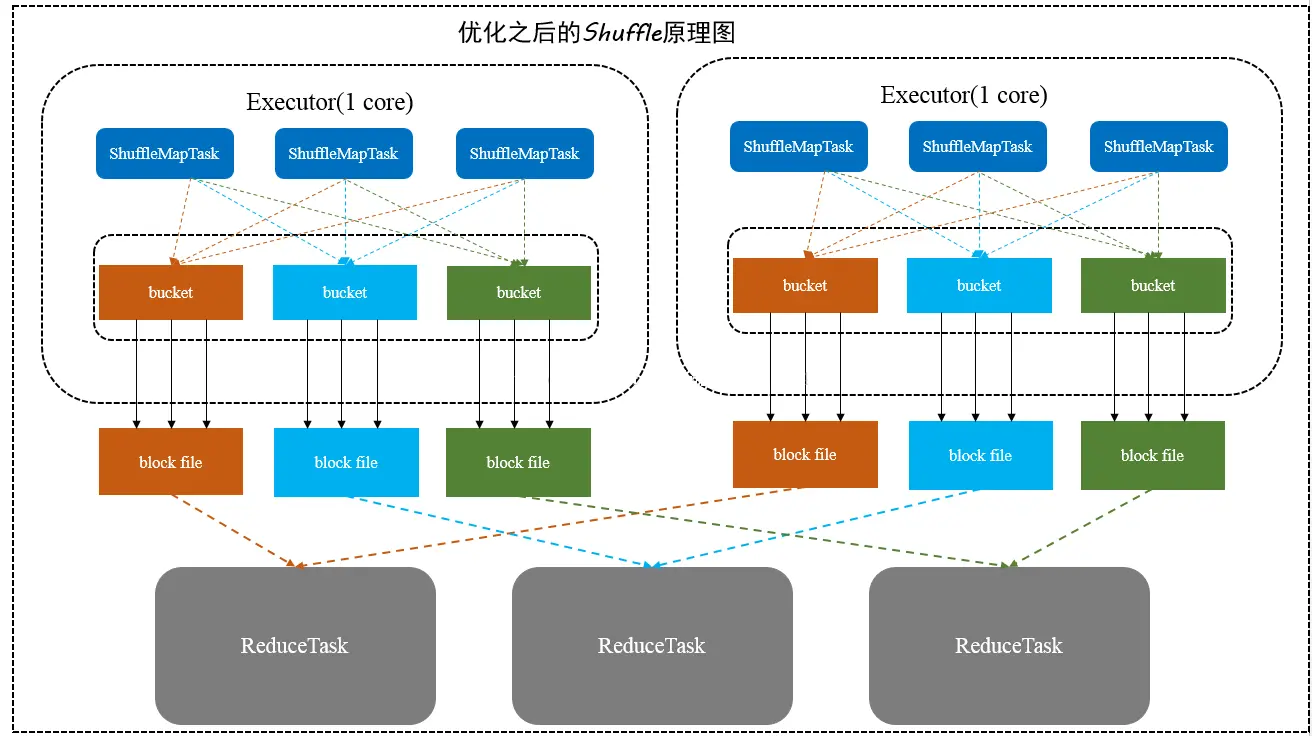 先简单说明一下情况。此时任务划分为了两个 Stage ,第一个 Stage 最上方有4个 MapTask , 而第二个 Stage 有3个 ReduceTask,但是如果我们现在的MapTask增多成1000个,那我们所产生的 block file 那不就有 MapTask*3 这么多了,在这时大量的IO操作会造成很大的性能问题