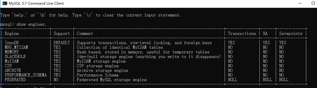 从上图我们可以查看出 MySQL 当前默认的存储引擎是InnoDB,并且在5.7版本所有的存储引擎中只有 InnoDB 是事务性存储引擎,也就是说只有 InnoDB 支持事务。