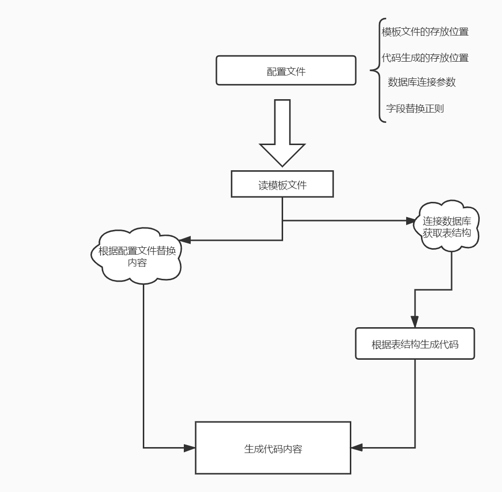 ctrl+c, ctrl+v然后拼命的改字段,改接口,改路由一波操作到下班😖,每天重复工作,不仅没时间提高自己或者逛掘金😛每天都累成狗在这样的背景下我们可以根据前端的页面的公共的部分和后端数据库的表结构生成模板文件少搬一些砖,下面说下我实现的一个简单的前端代码生成器的实现, 下面是流程图, 代码只有60行左右哦,你们都能根据自己的需求,进行改造的,早日脱离ctrl+c, ctrl+v