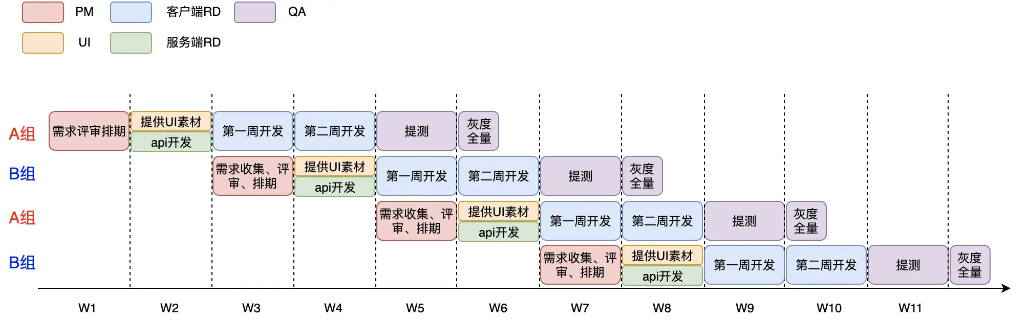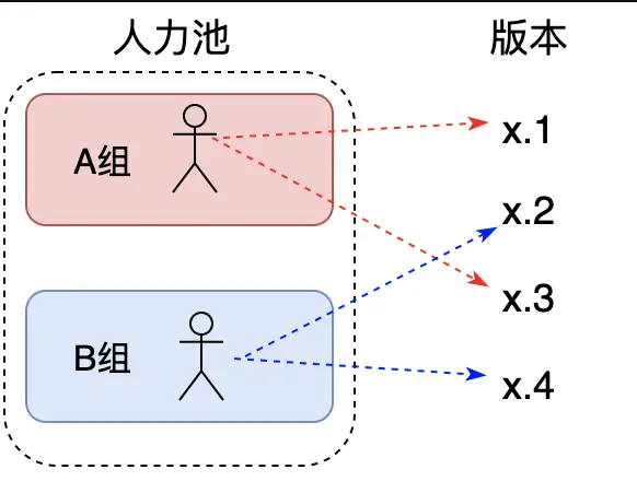 后来我们经过内部研究,提出了AB分组的方案,保证AB组是隔版本进行开发,当组内需求拆分有冲突时,需要在内部协调消化,避免RD出现每个版本都会参与开发的情况发生。