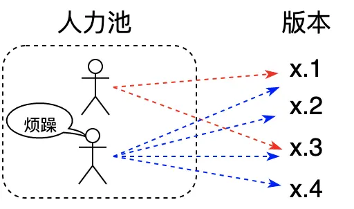 - 人力分配合理性:版本的需求是存在不确定性的,而App的需求熟悉度是存在和RD一一对应的,当熟悉度最高的RD在上个版本的时候,当前版本的版本主R就会很头疼,是“能者多劳”还是“合理分配”,给人力分配的合理性又带来了新的挑战。
