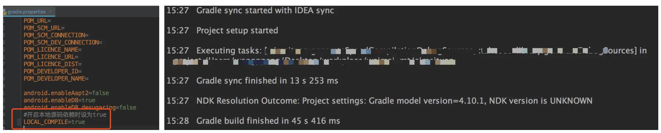 - Aimeituan工程独立编译自动配置:同事反馈配置团App源码依赖的配置项较繁琐,切换开发分支时需要反复进行配置,为了提供RD的开发体验,通过脚本自动修改WM提测分支的源码依赖配置项,只需修改Aimeituan的gradle.properties一个属性实现源码依赖切换,实现一键切换的功能,提高版本开发效率,优化项包括: