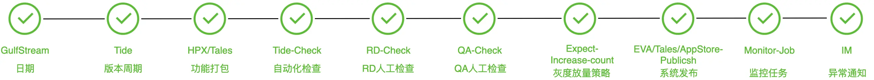 - 起始点来源于我们录入的GulfStream日期,由于双周迭代后,版本的迭代周期是可预期的,所以能够以季度维度录入GulfStream中,由此处触发整个链条的启动。