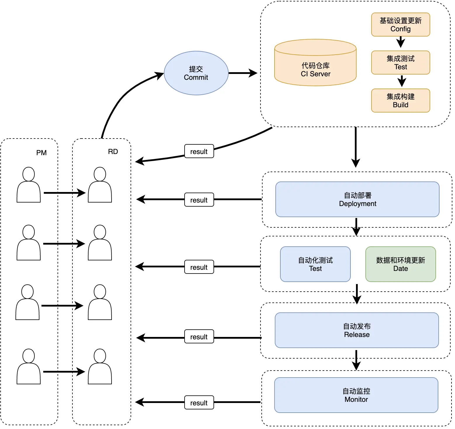从知乎话题“如何理解持续集成、持续交付、持续部署”,我们可以看到大部分研发团队,会从软件研发的角度进行定义,他们将软件的开发步骤拆解为持续集成、持续交付、持续部署,其中持续集成指开发人员从编码到构建的过程;持续交付指将已经集成构建完成的代码,交付给测试团队进行测试的过程;持续部署指将测试通过的软件交付给用户的过程。而产品团队会站在产品的角度来看,他们认为持续交付,是从需求的PRD文档提出来,到用户能够感受到这个需求的周期。