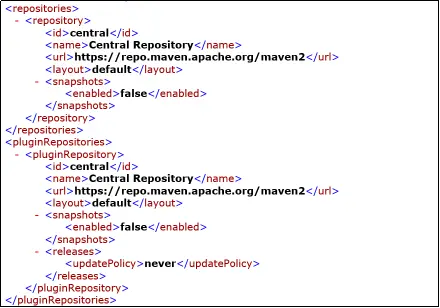 方式二:在pom.xml中配置远程仓库。我们项目的pom文件会继承maven安装路径下的一个超级pom。而在超级pom中,配置了一个默认的远程仓库,就是中央仓库。可以找到超级pom:maven-model-builder-3.2.5.jar中org\apache\maven\model\pom-4.0.0.xml。其中关于默认远程仓库的配置内容如下: