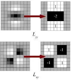 在SIFT中,Lowe用高斯差近似高斯的拉普拉斯算子来寻找尺度空间。SURF走得更远,使用Box Filter近似LoG。下图显示了这种近似值的演示。这种近似的一大优点是,借助积分图像可以轻松地计算出带盒滤波器的卷积。并且可以针对不同规模并行执行。SURF还依赖于Hessian矩阵的行列式来确定尺度和位置。