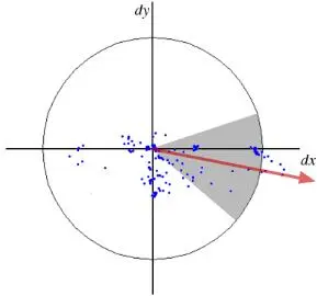 对于方向分配,SURF在水平和垂直方向上对大小为6s的邻域使用小波响应。适当的高斯权重也适用于它。然后将它们绘制在下图所示的空间中。通过计算角度为60度的滑动方向窗口内所有响应的总和,可以估算主导方向。有趣的是,小波响应可以很容易地使用积分图像在任何规模下发现。对于许多应用,不需要旋转不变性,因此无需查找此方向,从而加快了过程。SURF提供了称为Upright-SURF或U-SURF的功能。它提高了速度,并具有高达$pm 15^{circ}$的鲁棒性。OpenCV根据标志支持两种方式。如果为0,则计算方向。如果为1,则不计算方向并且速度更快。