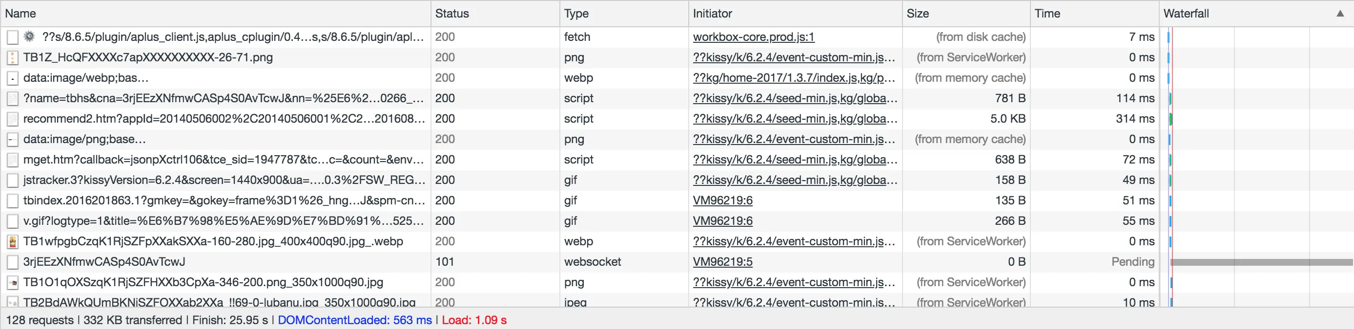 大家对 HTTP Cache(即 Cache-Control、expires 等字段控制的缓存)应该比较熟悉,如果对其它几种缓存可能还没什么概念。我们看一张开发者工具的截图: