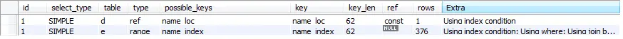 explain select e.no, e.name from emp e left join dept d on e.dept_no = d.no where e.name like 'Jef%' and d.name = '研发部';