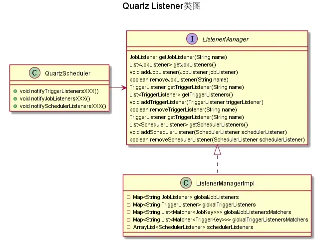 SchedulerListener不支持配置在quartz.properties里面,初始化Scheduler的过程中没有这一块的代码逻辑。如果要添加一个观察者,那么可以**通过StdScheduler.getListenerManager()获取ListenerManager实例**,通过它可以拿到所有观察者的引用。