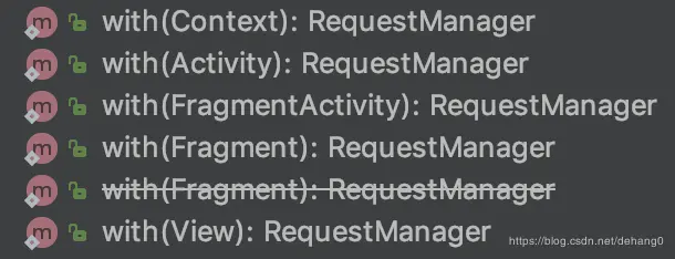 在Glide类中,有多个with方法的重载实现,最终都是返回RequestManager对象,(RequestManager负责管理发起的加载Request),如图: