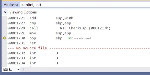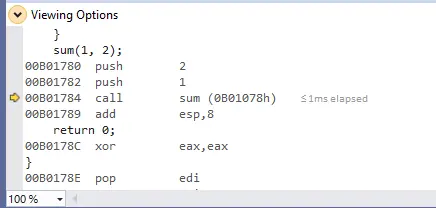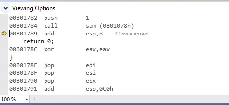 然后因为编译器的原因在call的时候还会有一个jmp来中转到后面的处理函数,因为jmp不影响堆栈,我们可以忽略掉它,这里是跳转到了sum函数的处理位置。