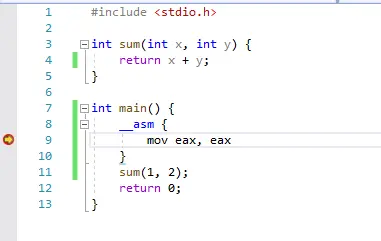 中间的一小段没有意义的汇编语言是为了方便设置断点,为后面的调试做好铺垫,因为有时会碰到找不到断点位置的情况,使用这个方法,可以在找不到断点的时候向后执行一次,而不破坏我们想调试的程序当前的堆栈状态,这里对main函数和sum函数的效果是类似的,这里直接跟着断点来执行分析sum函数的堆栈操作。