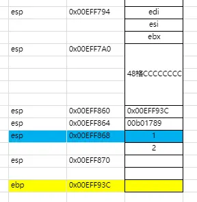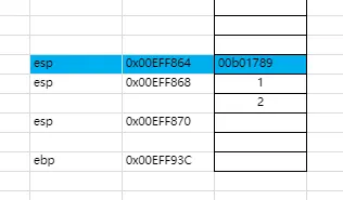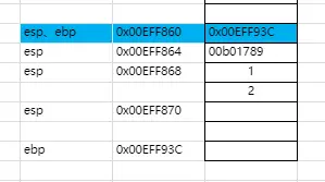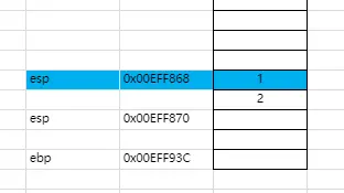 在程序的执行当中,我们一般都是按照从右向左的方式去处理的,这里也不例外,我们可以发现当我们调用sum函数对数字1和数字2进行处理的时候,将数字2和1依次压入栈中,这个时候堆栈的情况是这个样子的,esp的值已经减8。