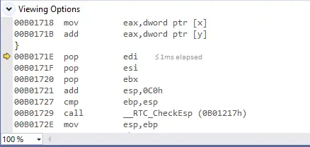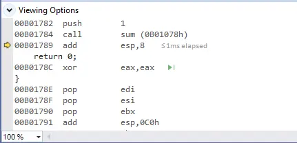 但是此时还有个问题,esp并没有回到调用前的位置,所以堆栈还是没有平衡的,如果堆栈不平衡,那在不断的执行的过程中,就会发生堆栈溢出,这里编译器是使用外平栈的方式来使堆栈恢复平衡的,它在esp的基础上增加了8。