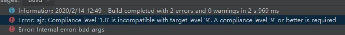 Error:ajc: Compliance level '1.8' is incompatible with target level '9'. A compliance level '9' or better is required