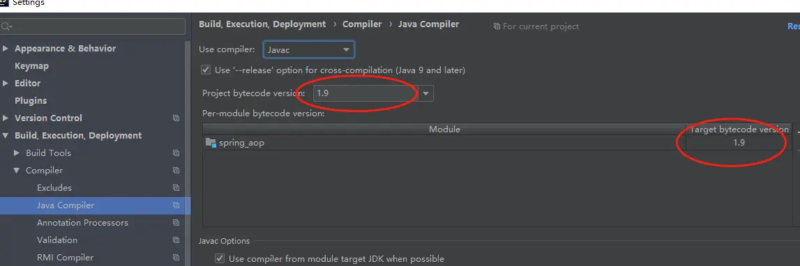 原因:本地使用的 JDK 版本为 1.8,此处如果配置1.9的话,会导致 Javac 编译器配置也发生变化,导致错误发生。