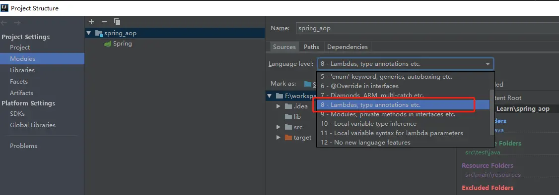 点击 File 标签里的 Project Structure,选择 Project Settings->Modules,选择1.8版本对应的 language level。