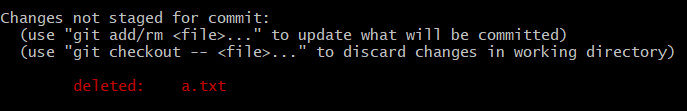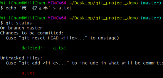 如上图,我们删除了一个文件,然后新建了一个文件,状态显示为一个可以被提交而一个则是未跟踪状态。
