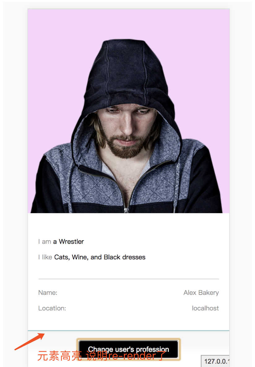 此时我们没有区分组件,所有的元素都写在一个页面中,点击按钮,整个app一起刷新(看到高亮的组件是最外层),然而我们实际上只更新了 文案的部分,这就是wasted render