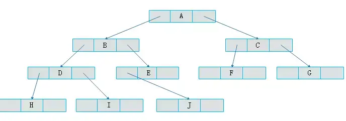 后序遍历:根据左->右->根的顺序便利整个二叉树,每个节点都遵照左->右->根这个顺序规则执行。比如后序遍历上图的二叉树,遍历访问的顺序为:HIDJEBFGCA