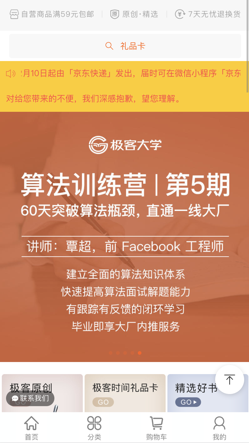 之前一直做得是pc端项目,使用的比较多的是element-ui,一直没怎么接触过移动端项目。趁着这段时间比较空闲,就了解了下vant,仿照极客时间的移动web商城。闹了个尴尬,极客时间商城就是用vant做的,难怪用着真香。 商城截图: