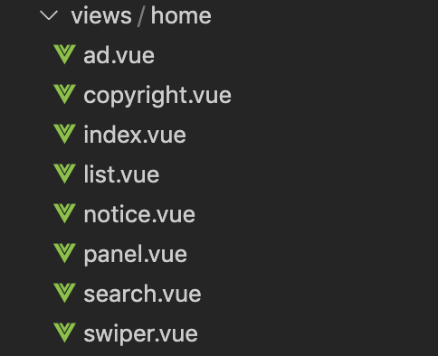 我们使用vue-cli3.0生成基础目录结构,在view目录下新建一个home文件夹存放首页的内容,index.vue组件来承载上面说的七个区块,容器组件作为页面的顶层组件,可以用来处理一些数据请求并传递给区块组件,文件划分如下: