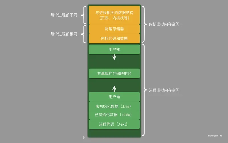 每一个进程都有独立的进程空间,如下图所示。进程空间中能够用于内存分配的区域主要分为两种: